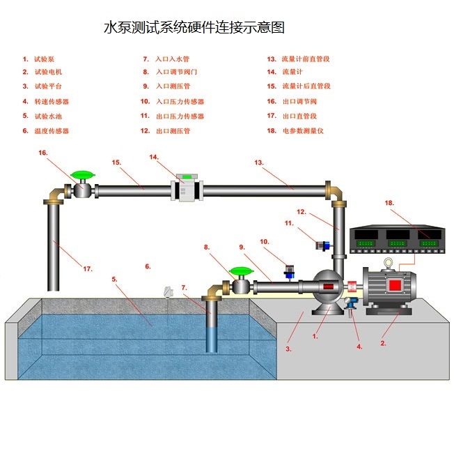 本系统由仪器仪表控制柜、测试台架(可以选配)及管道系统(用户自备)组成。其中采用了高精度的转矩转速传感器(可以选配)和高精度的流量计及压力传感器,以满足对各种型号的离心泵、混流泵、轴流泵、和旋涡泵的转矩、转速、轴功率、流量、入口压力、出口压力、扬程以及效率等进行精确测量的需求。可对各种水泵进行性能试验和汽蚀试验(可选配)。